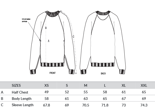 Raglan sleeves. 2x1 ribs at collar, sleeve cuffs and bottom hem. Three-needle flatlock stitches at neck, sleeves, side seams and half moon. Two-needle stitches at the bottom hem and sleeve cuffs. Inside grosgrain back neck tape. Self-fabric half moon at back neck.